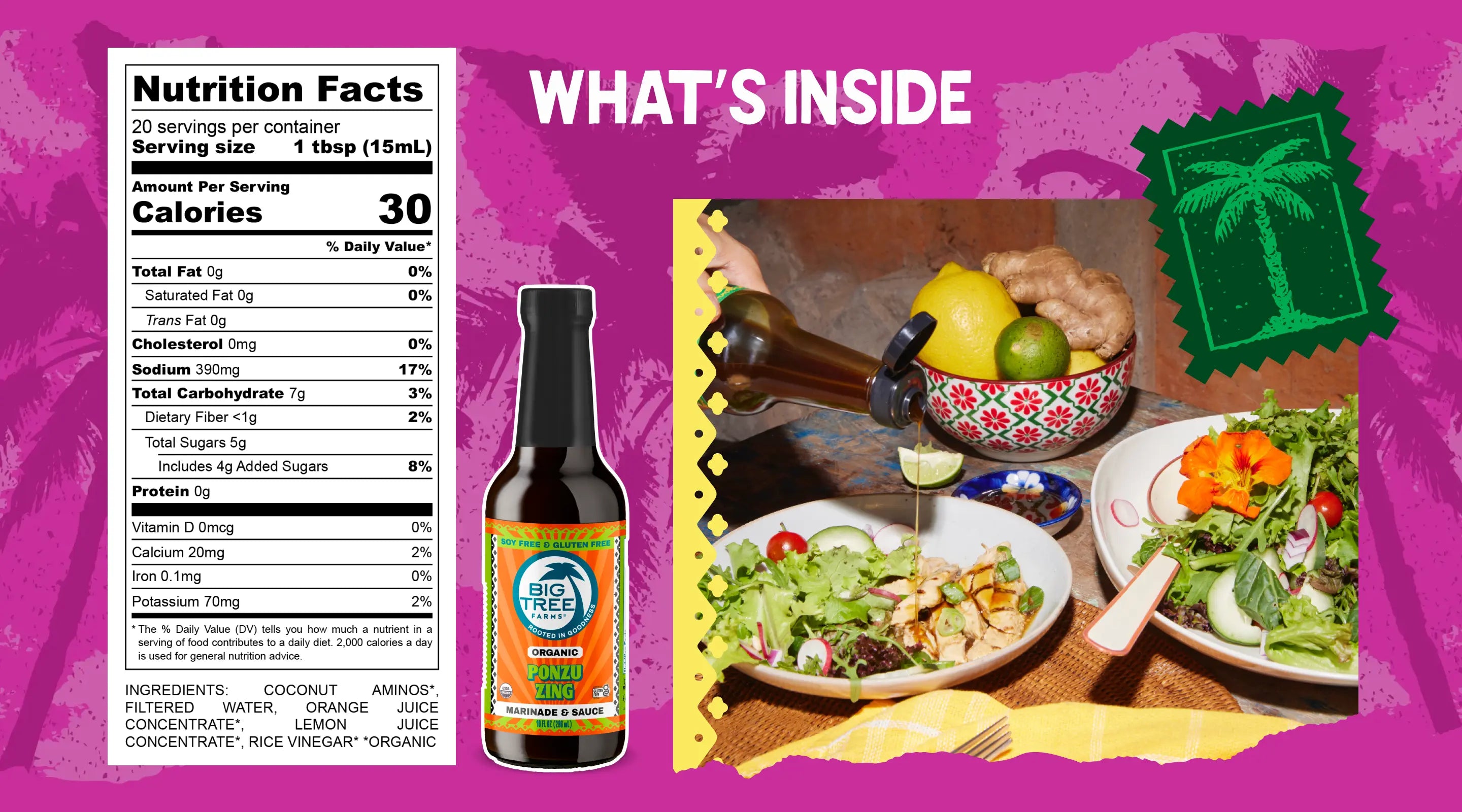 Coconut Aminos* (Coconut Blossom Nectar*, Water, Balinese Sea Salt), Water, Orange Juice Concentrate*, Lemon Juice Concentrate*, Rice Vinegar*.